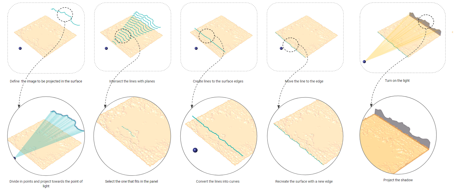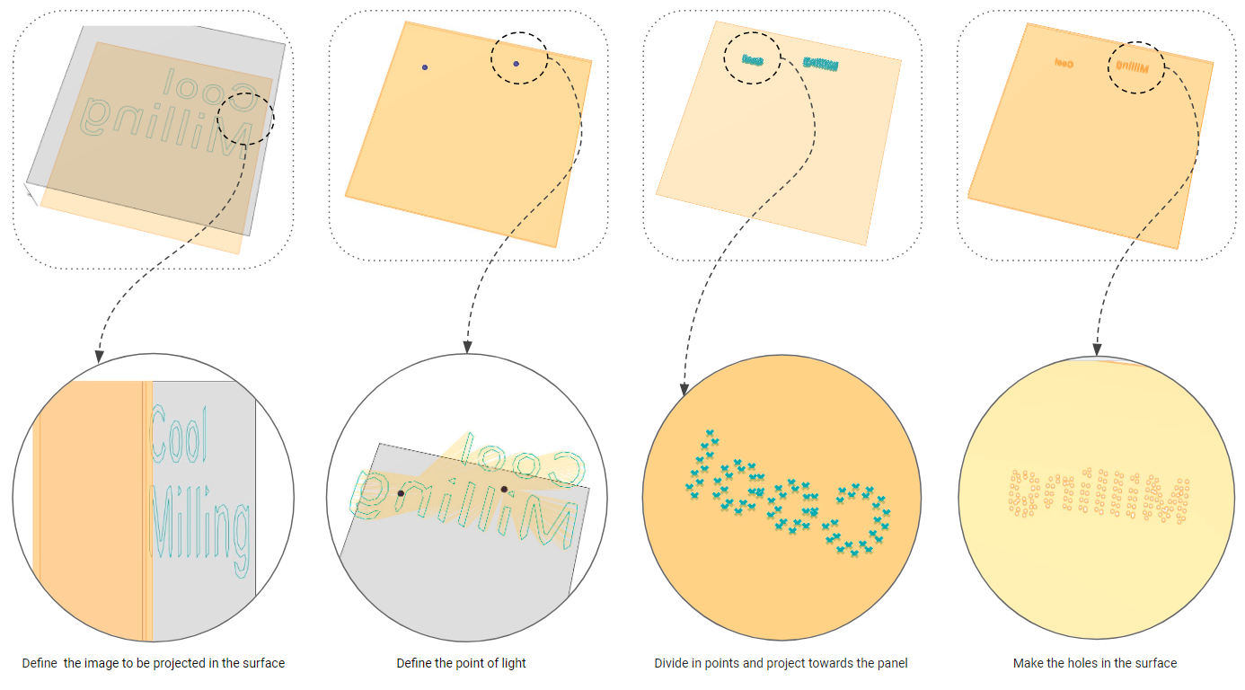 For the development of this method, the point of light is located outside the panel, perpendicularly to the surface normal. Once its location has been defined, a curve with a figurative profile is placed on top the surface between the source of light and a second surface where the image will be projected, however closer to the edge where the light is, otherwise the shadow will not be well seen. The curve is divided into multiple points from which visual rays will be traced to the defined point of light. By extending these rays, they will intersect with the projecting surface. After obtaining the points of intersection and interpolating them, it results in the final shadow.