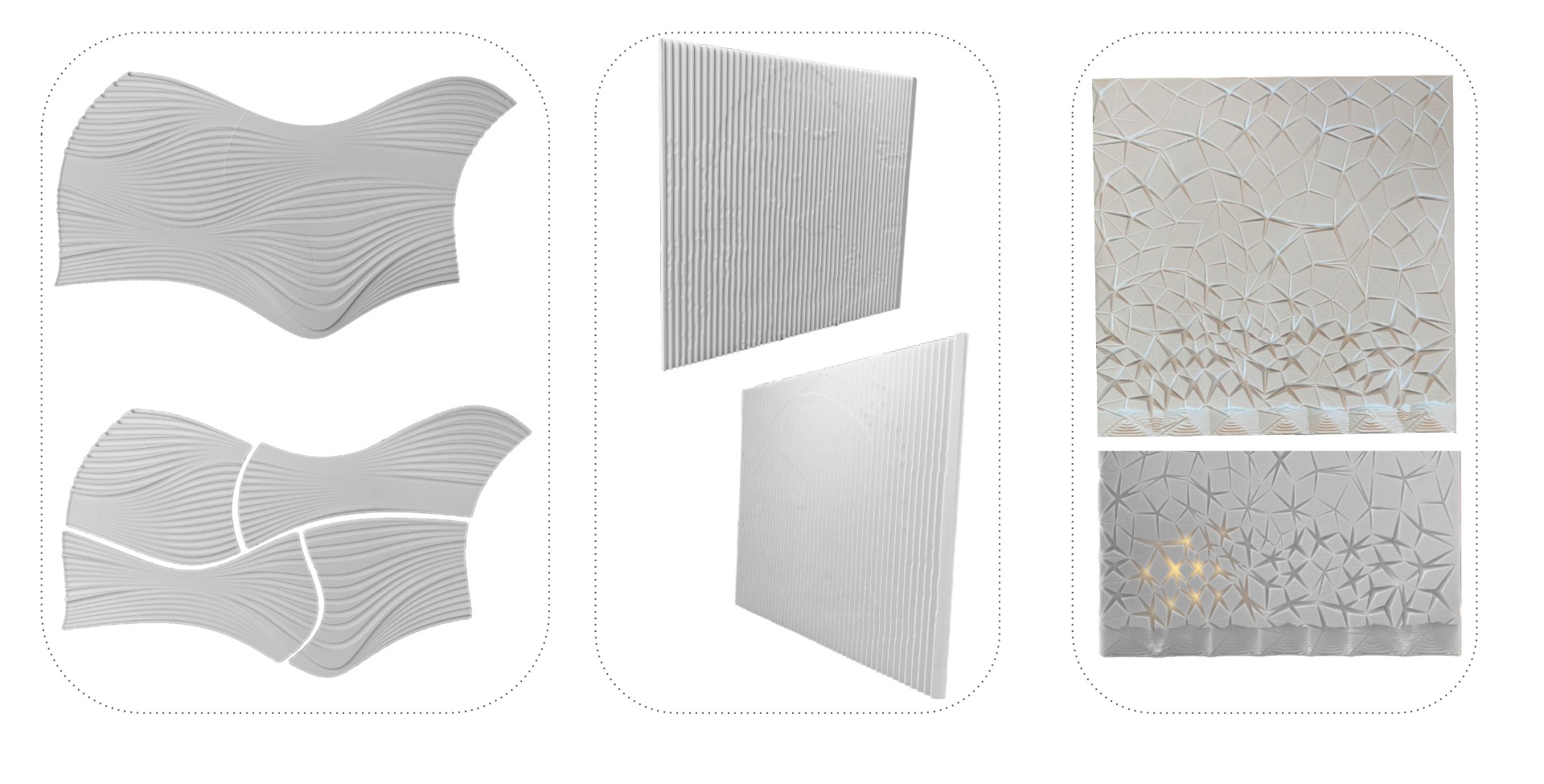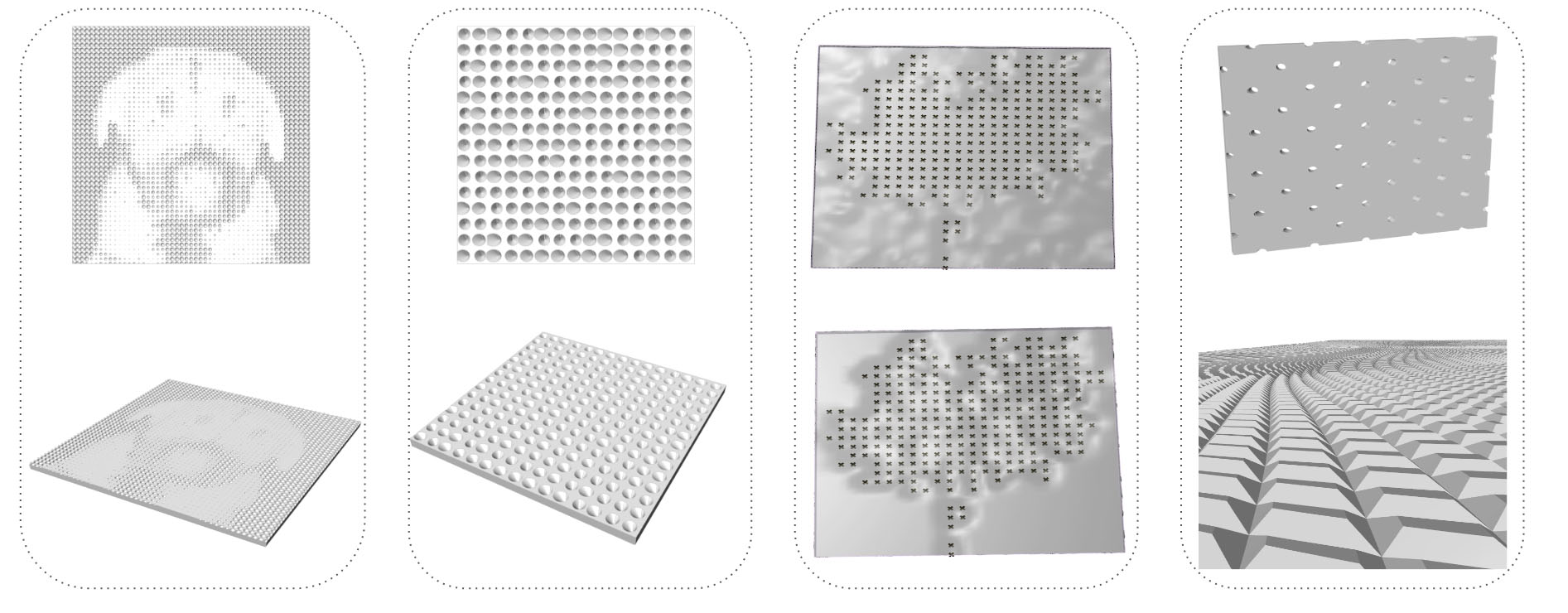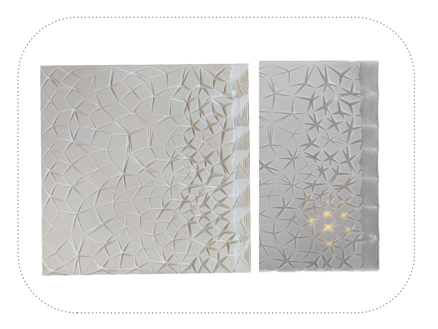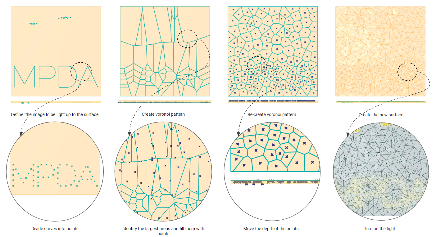 In the second case, the image points depth must be less than a third of the width of the material so the light refraction can be seen and for the other points the height can oscillate between half the width of the material and the surface top to distract the observer. When the point heights have been established, pyramidal surfaces are generated, thus forming an interesting set of highs and lows on the panel.